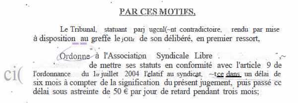 Désolé ou pas, secondaire ou pas, il est bien indiqué dans le jugement une décision de justice qui condamne l'ASL à la mise en conformité des statuts sous réserve d'astreinte.